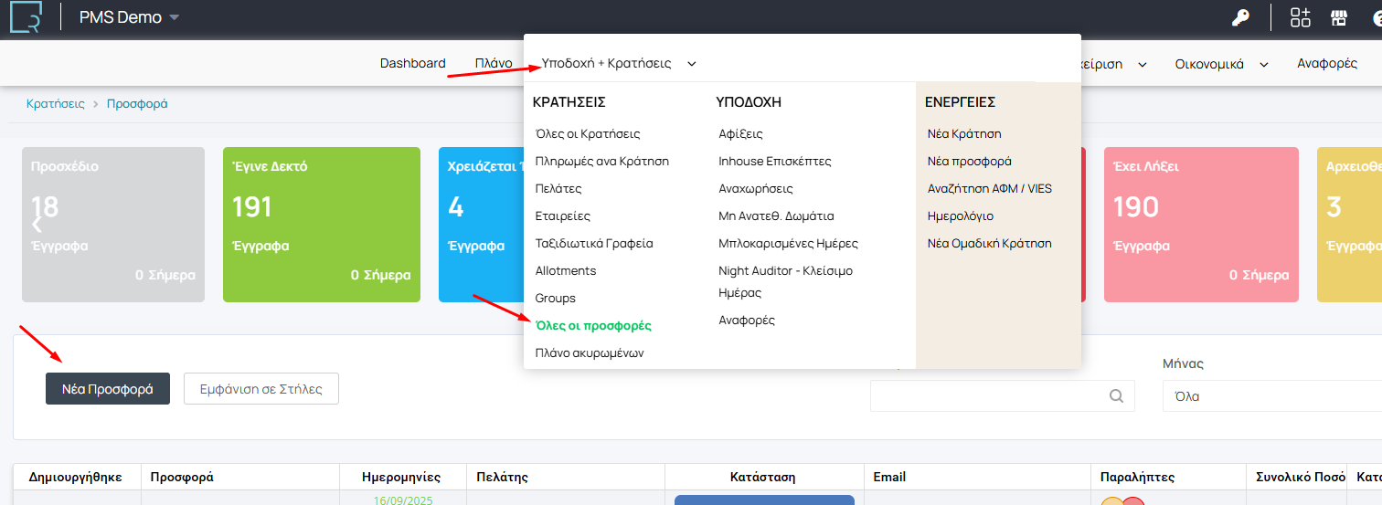 Μέσα από το Υποδοχή + Κρατήσεις -> Όλες οι Προσφορές -> Νέα Προσφορά: