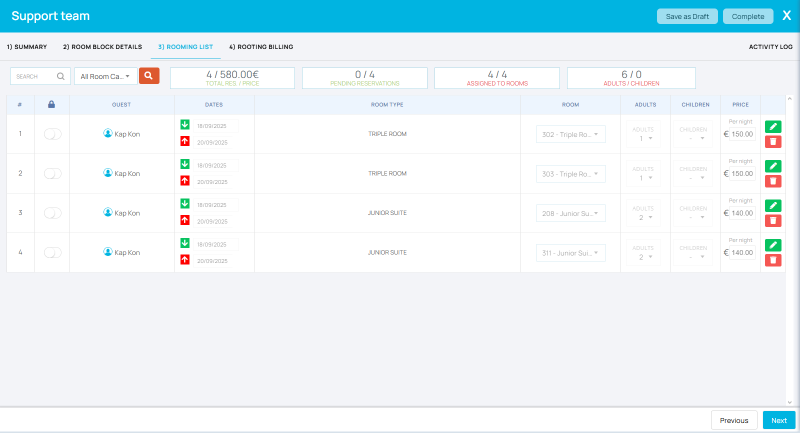 Αφού πατήσετε “Επόμενο” στο βήμα 1, θα μεταφερθείτε στο tab ROOM BLOCK DETAILS. Εδώ μπορείτε να ελέγξετε περαιτέρω την πληρότητα του group. Αυτόματα το σύστημα σας έχει φέρει τις επιλογές σας από το summary. Βλέπετε λοιπόν τους τύπους δωματίων και τη διαθεσιμότητα που έχετε στο PMS. Μόλις πατήσετε “Επόμενο” τότε θα δημιουργηθούν οι κρατήσεις στο πλάνο και θα κλείσει η διαθεσιμότητά σας.